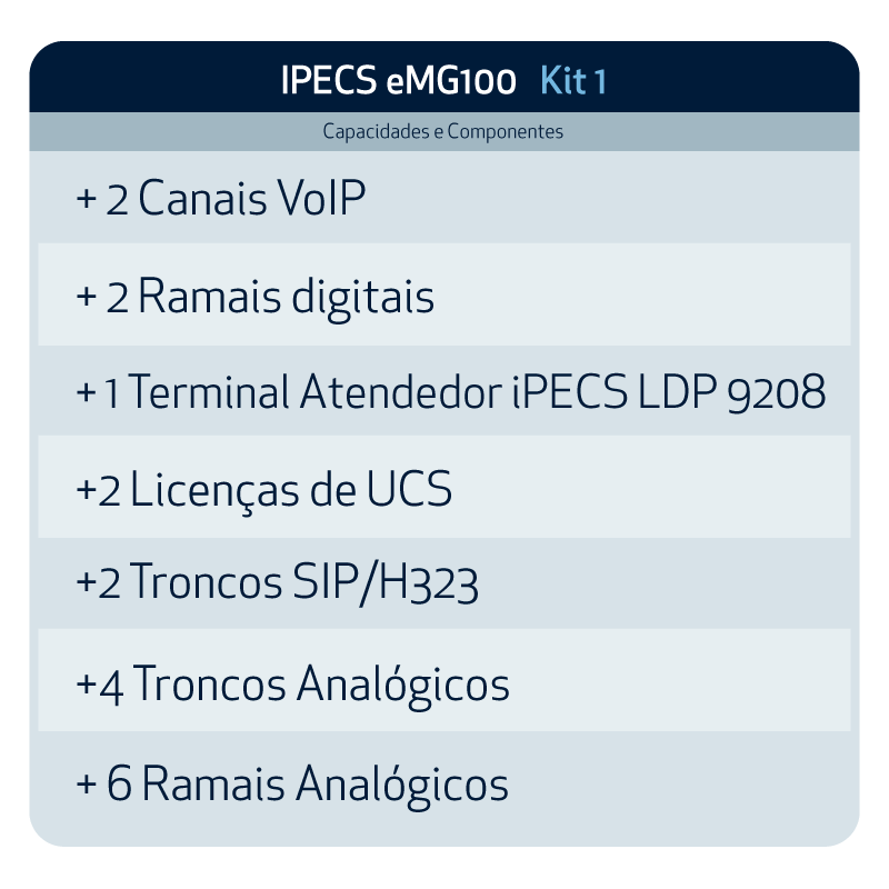 O sistema inclui duas portas IP, dois clientes de desktop padrão UCS (Unified Communications Solution) com licenças de softphone de voz e duas licenças de clientes móveis UCS. O iPECS eMG100 é construído sobre uma arquitetura dinâmica que oferece comunicações econômicas e expansibilidade acessível para empresas de pequeno e médio porte.